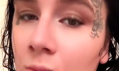 Jaw dropping tattooed whore spreads legs broad to expose juicy slit
