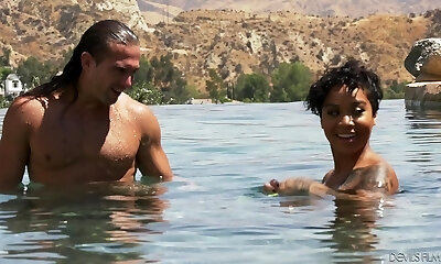 Brunette stunner have interracial fun outside at pool