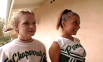 Cheerleader in panties gobbling balls in ffm porn shoot
