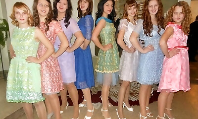 Mesmerizing brunette cougar in black dress seduced by redhead milf